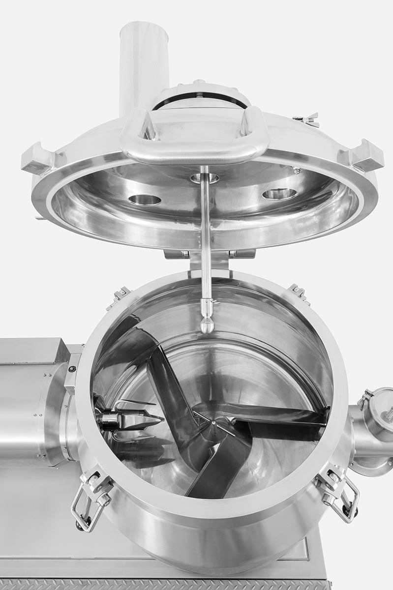 2.粘合剂从锥形料斗进入物料锅,待料斗关闭后在混合桨的搅拌下,粉料在容器内作旋转运动,同时物料沿锥形壁方向变化,逐步生成液桥。在桨叶和筒壁对物料的挤压、磨擦、捏合的作用下,物料逐步转变为疏松的材质。然后,开启出料门,湿颗粒在桨叶离心力作用下推动出料斗。